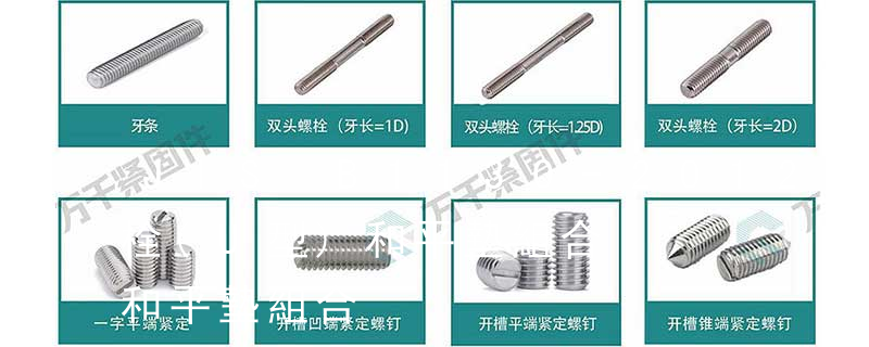 螺栓類:外六角螺栓、外六角法蘭面螺栓、內六角圓柱頭螺栓、吊環螺栓、膨脹螺栓、沉頭內六角螺栓、盤頭內六角螺絲、馬車螺栓、雙頭螺栓、蝶型螺絲、活節螺栓、地腳螺 栓、U型螺栓、四角螺栓等 螺帽類:鉚螺母、吊環螺母、六