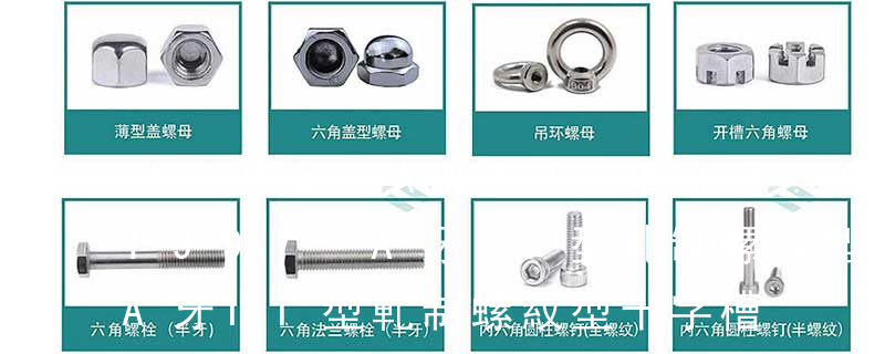 螺栓有:1、方頭螺栓,2、半圓頭方頸螺栓,3、十字槽盤頭螺釘,4、內六角沉頭螺釘,5、方螺母C級,6、蝶形螺母,7、六角頭螺栓,8、十字槽盤頭自攻螺釘。大小有M18、M6、M8、M16、M10、M12、M14、M20等型號。通常用