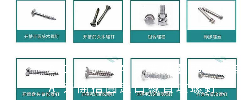 自切自攻螺釘有以下幾種型式:十字槽盤頭自切自攻螺釘,十字槽沉頭自切自攻螺釘。十字槽半沉頭自切自攻螺釘,六角頭自切自攻螺釘。3、自擠自攻螺釘(自攻鎖緊螺釘)自擠自攻螺釘?shù)穆菁y一般為機螺紋,很少采用自攻螺紋。在扳擰 1、Flat:平頭 (鎖入后,頂部與工作件齊平)2、Oval:色拉頭、O頭、半沉頭 3、Round:圓頭 4、Pan:圓扁頭 5、Truss:大圓扁頭 6、Hex:六角頭 A-5:Finish Code/外觀處理。公制自攻螺絲 :于品名后方直接標示 Tapp