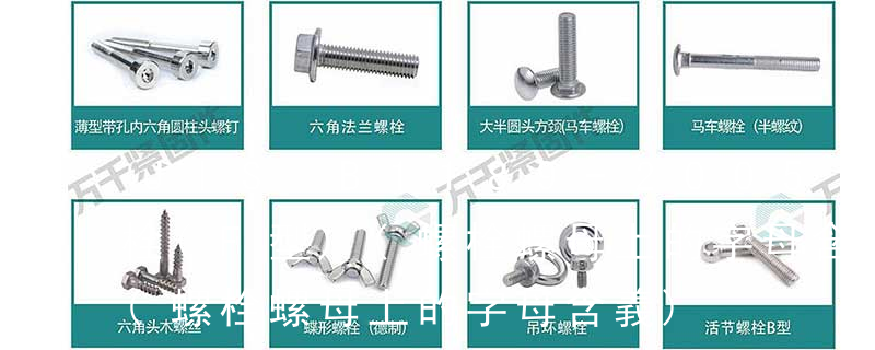 eye bolt 吊環螺栓(也叫環首螺栓, 其實這個叫法很多,大概是不同地區的緣故)Piston bolt 活塞螺釘Winding bolt 線圈螺釘Hexagon head bolts 六角頭螺栓Hexagon flange bolts 六角法蘭螺栓Carriage bolt馬車螺栓Square head bolt方頭螺栓Flat