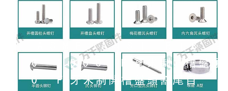 1.機螺釘 2.自攻螺釘 3.鉆尾螺釘 4.墻板釘 5.纖維板釘 6.木螺釘7.六角木螺釘 8.不脫出螺釘 9.組合螺釘 10.微型螺釘 11.家具螺釘 12.電子螺釘 13.鏈帶螺釘頭型:1.六角頭(hexagon head)2.六角頭法蘭面(hexagon head with